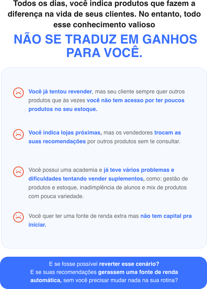 Na sua rotina diária, você já faz recomendações. Você indica os melhores suplementos, produtos ou serviços para seus clientes, amigos e seguidores. Mas, e se você pudesse levar essa relação a um novo patamar?