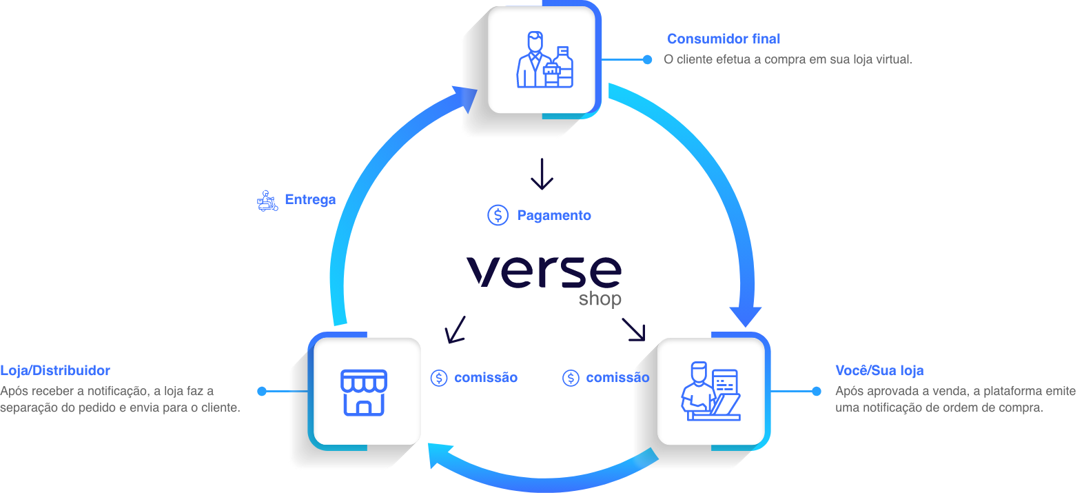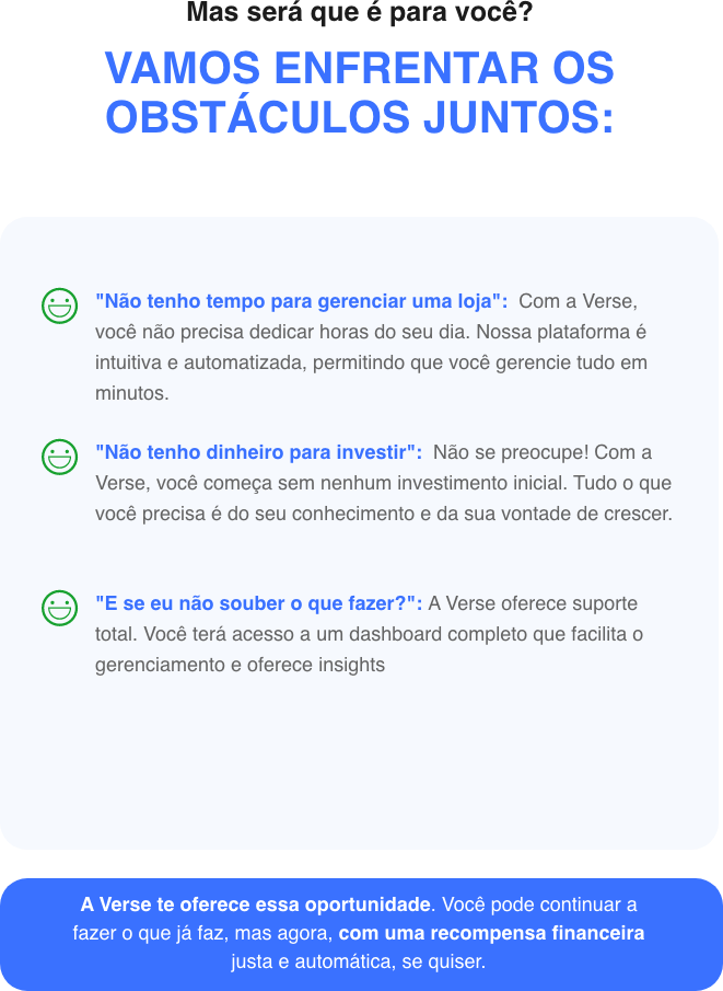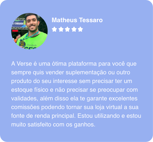 A Verse surge como a solução que você estava esperando. Somos uma plataforma inovadora que permite que você crie uma loja virtual completa e personalizada, conectando você diretamente a fornecedores que têm estoque dos melhores produtos e marcas. Esqueça os riscos e os altos custos de uma loja física. Com a Verse, você pode vender sem precisar investir em estoque, estrutura física ou logística.