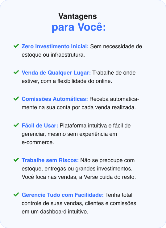 Com a Verse, você elimina as barreiras que impedem muitas pessoas de empreender no mundo digital. Aqui estão os benefícios que você não encontra em outras plataformas