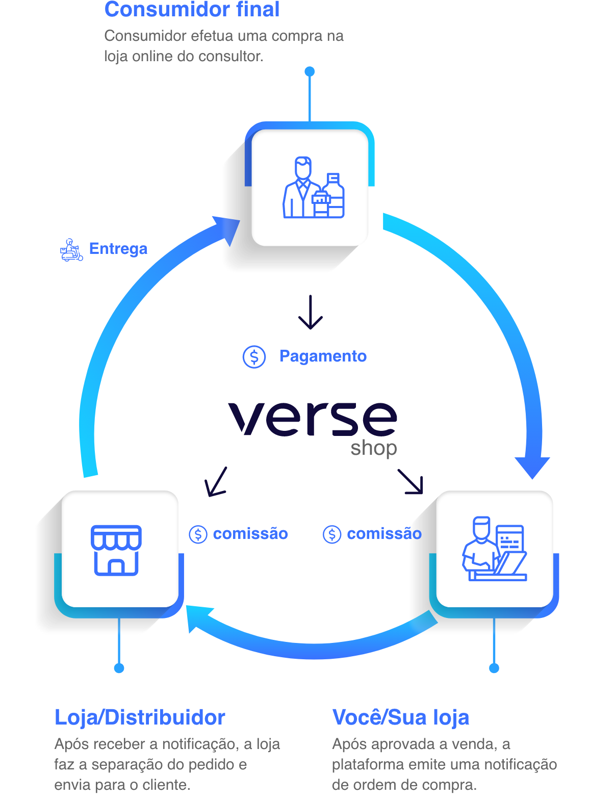 Após uma venda, o distribuidor parceiro da Verse é notificado, prepara o pedido e realiza a entrega diretamente ao cliente via tele entrega ou correio. Todo o processo é automatizado.